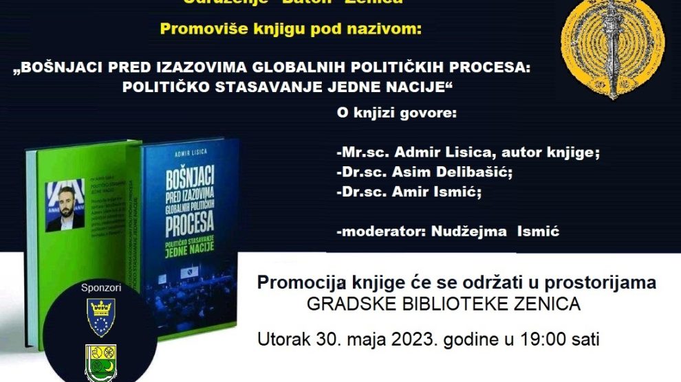 Obavještavamo Vas da će Udruženje “Baton” Zenica organizovati promociju knjige pod nazivom: „Bošnjaci pred izazovima globalnih političkih procesa: političko stasavanje jedne nacije“ autora mr.sc. Admira Lisice. Promocija će se održati u prostorijama Gradske biblioteke Zenica dana 30. maja...