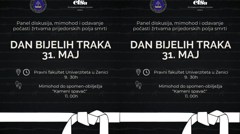Pravni fakultet UNZE nastavlja tradiciju obilježavanja Dana bijelih traka, a ove godine u saradnji sa Evropskim udruženjem studenata prava Zenica (ELSA Zenica). Manifestaciju obilježavanja Dana bijelih traka upriličavamo 31. 5. (srijeda) u sali Prf 1 u zgradi Pravnog fakulteta s početkom...