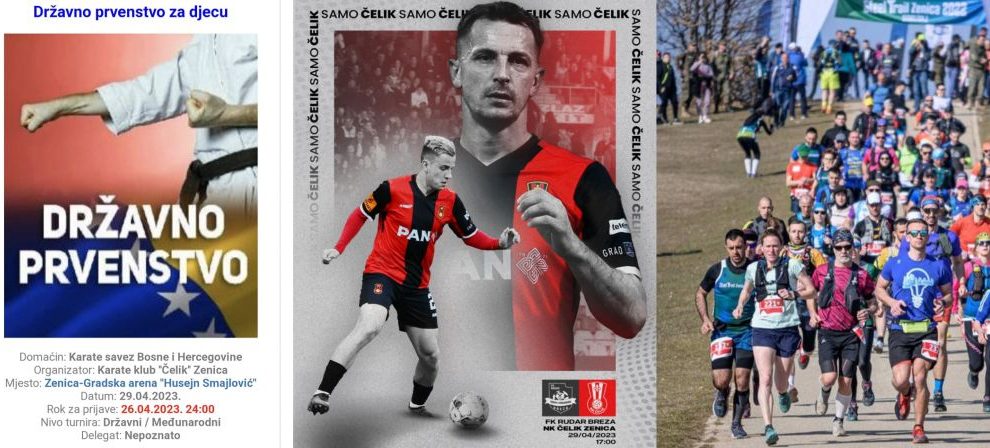 Donosimo Raspored utakmica zeničkih ekipa i takmičenja za predstojeći vikend, 29. i 30.4.2023.godine, do kojih smo uspjeli doći: SUBOTA, 29.4.2023.godine: Zenica: Državno prvenstvo u karateu za djecu (gradska Arena „Husejin Smajlović“ Zenica); 11 sati, Zenica: NK Čelik – NK Romari Vitez...