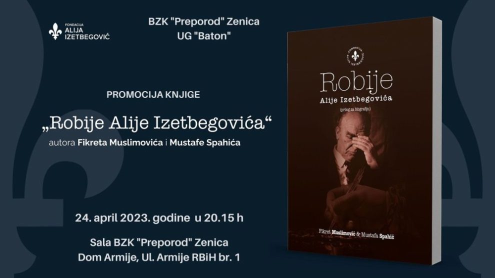 Poštovani, obavještavamo vas da će se promocija knjige “Robije Alije Izetbegovića”, autora Fikreta Muslimovića i Mustafe Spahića, a u izdanju Fondacije “Alija Izetbegović”, održati danas, 24. aprila 2023. godine u 20.15 h, u sali BZK “Preporod” Zenica...