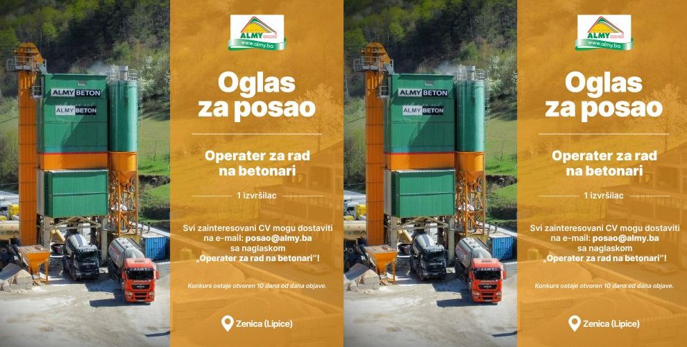 Oglas za posao: Operater za rad na betonari- Almy d.o.o. Zenica objavljuje konkurs za prijem u radni odnos: POZICIJA: Operater za rad na betonari LOKACIJA: Lipice/Zenica BROJ IZVRŠILACA: 1 POTREBNE KVALIFIKACIJE: – SSS tehničkog smjera – Poznavanje rada na računaru –...