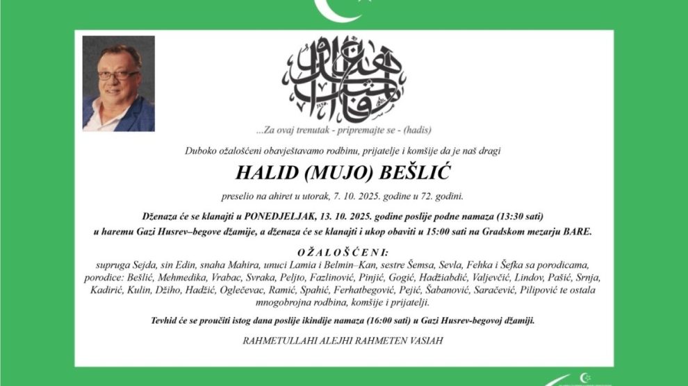 Cijela Bosna i Hercegovina, ali i region tuguje i oprašta se od legendarnog Halida Bešlića. – Povorka sa vozilom, u kojem će biti tijelo Halida Bešlića, poslije klanjanja dženaze u Begovoj džamiji kretat će se kroz Ferhadiju, a na glavnu ulicu će se uključiti kod Vječne vatre. Tužna...