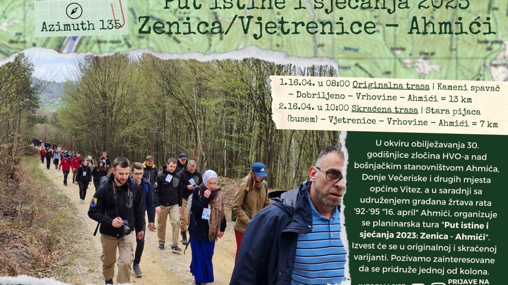 U okviru obilježavanja 30. godišnjice zločina HVO-a nad bošnjačkim stanovništvom Ahmića, Donje Večeriske i drugih mjesta općine Vitez, organizuje se planinarska tura “Put istine i sjećanja Zenica – Ahmići” u dvije varijante 1. Originalna planinarska tura učesnike vodi iz...