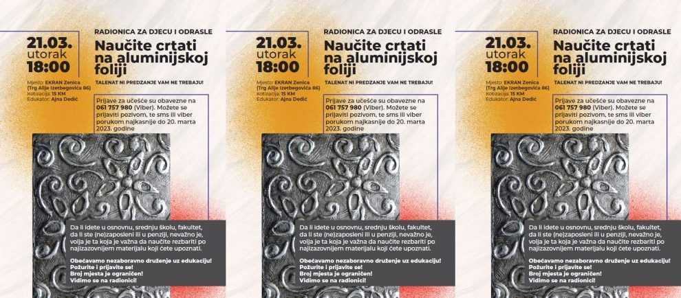 Otvorene prijave za učešće u kreativnoj radionici “Crtanje na foliji”- Jeste li ikada čuli da možete naučiti crtati, a da za to nemate talenat? Čini se gotovo nemoguće, zar ne? Moguće je! Prijavite se za učešće na kreativnoj radionici „CRTANJE NA FOLIJI“ 21. marta 2023. godine...