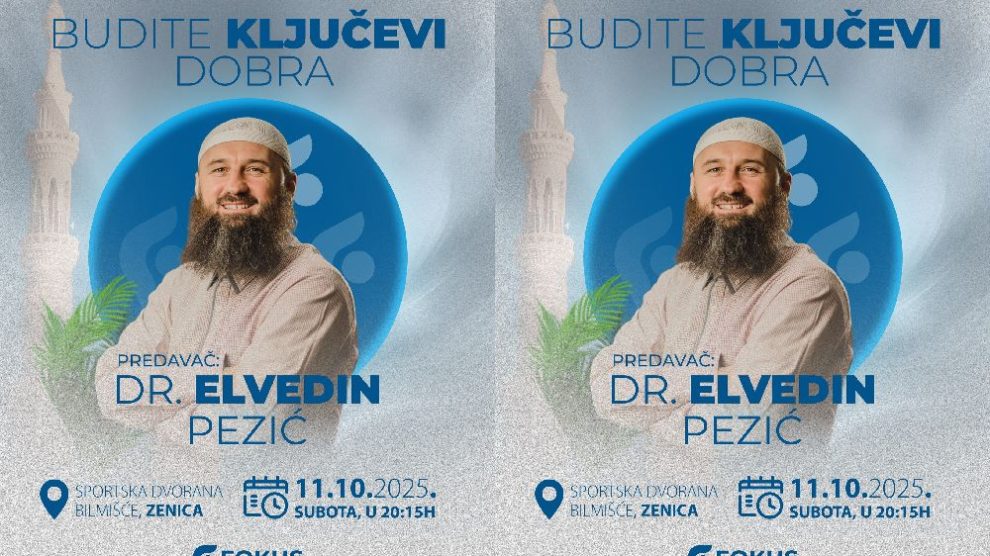 Udruženje Fokus Zenica organizuje javno predavanje poznatog islamskog predavača dr. Elvedina Pezića na temu „Budite ključevi dobra“. Predavanje će se, prema riječima organizatora, baviti temama lične odgovornosti, pozitivnog djelovanja i uloge pojedinca u širenju dobra i moralnih...