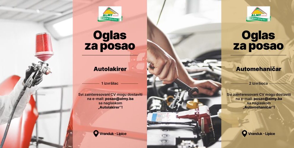 Oglas za posao: Autolakirer i automehaničar- Almy d.o.o. Zenica objavljuje konkurs za prijem u radni odnos: POZICIJA: Autolakirer LOKACIJA: Vranduk-Lipice BROJ IZVRŠILACA: 1 POTREBNE KVALIFIKACIJE: – SSS, – Poželjno iskustvo, – Spremnost na rad u timu. NUDIMO: –...