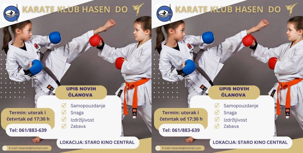 Karate klub “HASEN DO”Zenica vrši upis novih članova u karate školu. 👈 Draga djeco, prijatelji i simpatizeri Karate klub ”Hasen do” Zenica organizuje upis novih članova u karate školu. Upisati se mogu sva djeca od 5 godina pa na dalje. Karate je sport za dječake i djevojčice...