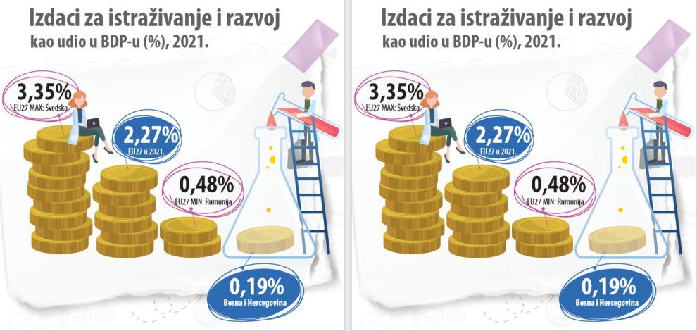 Bosna i Hercegovina je sa ulaganjem od 0,19% BDP-a u istraživanje i razvoj u 2021. godini bila daleko ispod prosjeka 27 zemalja EU koji iznosi 2,27%. Od svih 27 članica EU, Rumunija izdvaja najmanje BDP-a 0,48%, a Švedska najviše 3,35%, objavila je Agencija za statistiku BiH u publikaciji...