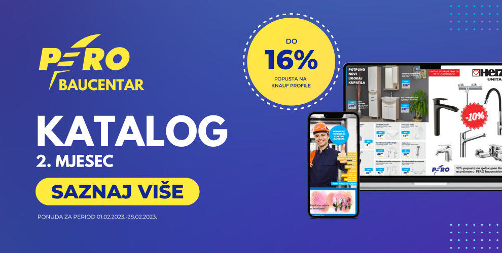 Pogledajte akcijski katalog PERO baucentara za 02/2023 U PERO katalogu za 2. mjesec 2023. godine očekuju Vas vrhunski popusti i super cijene odabranih artikala, a posebno izdvajamo popuste na artikle iz sljedećih robnih grupa: Vrtni program (do 21%) Knauf profili (do 16%) Elektro...