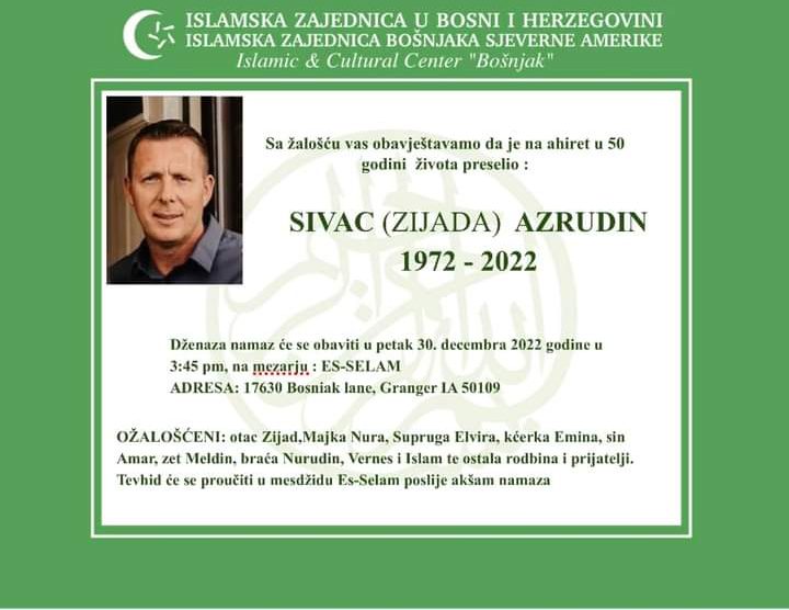 Jučer je do naše Zenice i Donje Gračanice, gdje je rođen, došla došla vijest da je u Sjedinjenim Američkim Državama u pedesetoj godini života preselio na ahiret Azrudin Sivac. Poslije predatog rahmeta i proučene fatihe, na trenutak se vratih trideset godina unatrag u vrijeme kada smo bili...