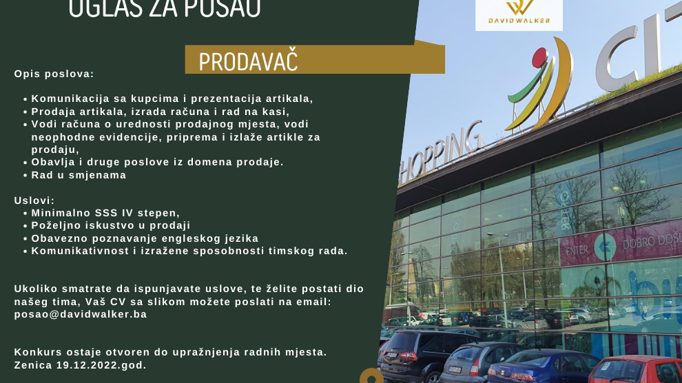 Oglas za posao: Prodavač u parfimeriji- Prodavač / Prodajno mjesto Shopping City Zenica Opis poslova: Komunikacija sa kupcima i prezentacija artikala, Prodaja artikala, izrada računa i rad na kasi, Vodi računa o urednosti prodajnog mjesta, vodi neophodne evidencije, priprema i izlaže...