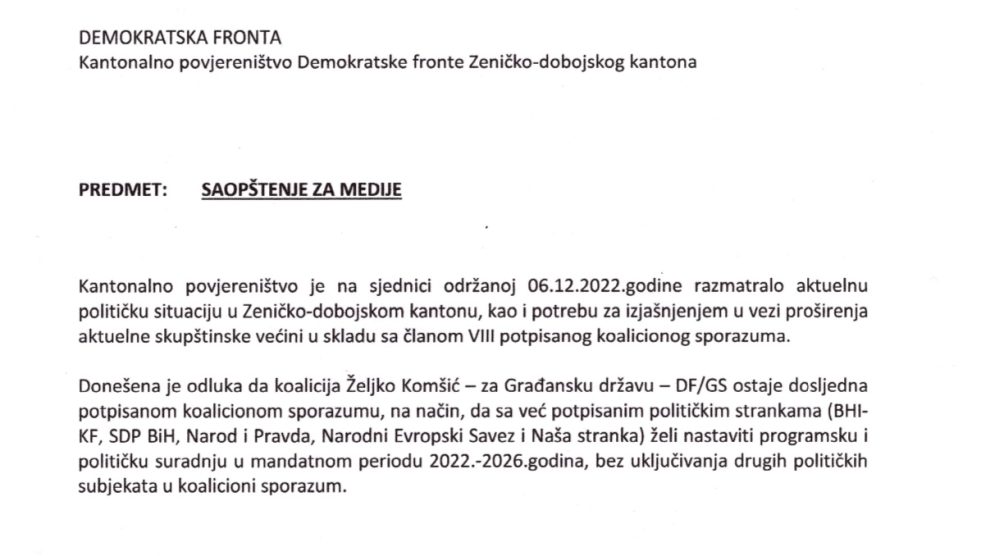 Kantonalno povjereništvo je na sjednici održanoj 06.12.2022.godine razmatralo aktuelnu političku situaciju u Zeničko-dobojskom kantonu, kao i potrebu za izjašnjenjem u vezi proširenja aktuelne skupštinske većine u skladu sa članom VIII potpisanog koalicionog sporazuma. Donesena je odluka...