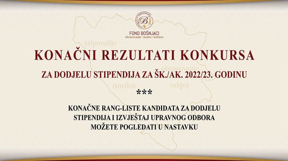 Na osnovu Pravilnika o dodjeli stipendija i Odluke Upravnog odbora Fonda ”Bošnjaci” objavljen je Konkurs za dodjelu stipendija za šk./ak. 2022/23. godinu. Nakon objave preliminarnih rezultata i provedenog žalbenog postupka Upravni odbor Fonda je utvrdio konačne rang-liste...