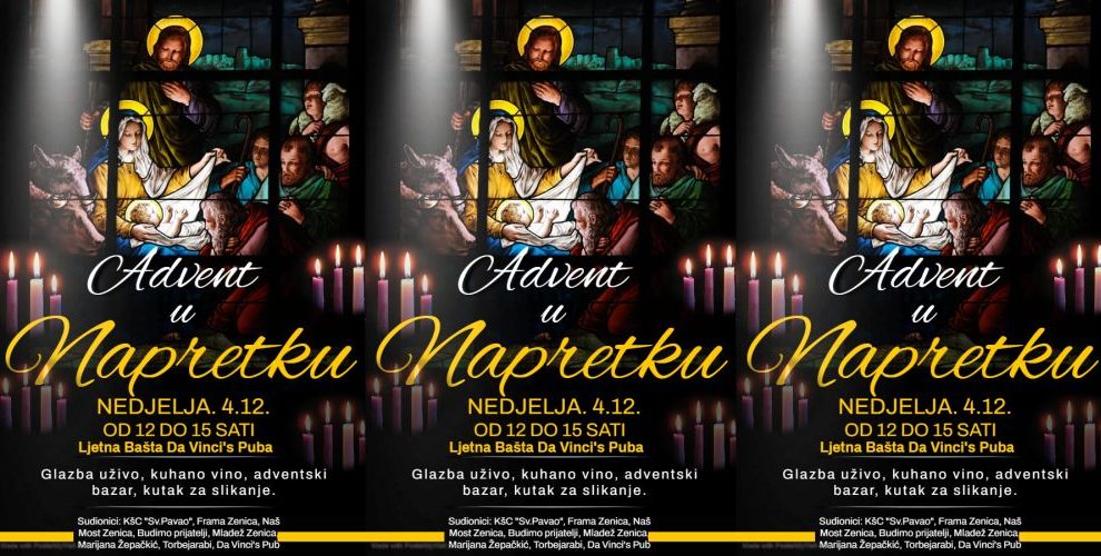 Poštovani sugrađani, hrvatsko kulturno društvo “Napredak” Zenica poziva Vas na druženje uz glazbu uživo, kuhano vino, kolače i adventski bazar. “Advent u Napretku” će se održati u nedjelju, 4.12., od 12 do 15 sati u ljetnoj bašti hrvatskog doma “Kralj...