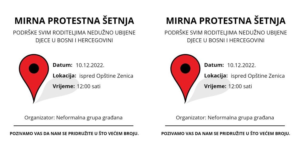 NAJAVA: Mirna protestna šetnja u znak podrške svim roditeljima nedužno ubijene djece u BiH- Ispred Neformalne grupe građana Vas pozivamo da nam se pridružite 10.12.2022. godine u 12h ispred Opštine Zenica na mirnoj protestnoj šetnji u znak podrške svim roditeljima nedužno ubijene djece u...