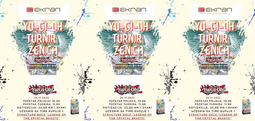 YU GI OH TURNIR NAPOKON I U ZENICI FAMILY CENTAR EKRAN 26.11.2022 Početak prijava: 10:00 Početak turnira: 11:00 Kotizacija: 22,00 KM i svaki učesnik sa time kupuje 1 Structure deck “Legend of the Crystal Beasts” (koji je inače u prodaji 27,90 KM). Svaki učesnik turnira igra sa...