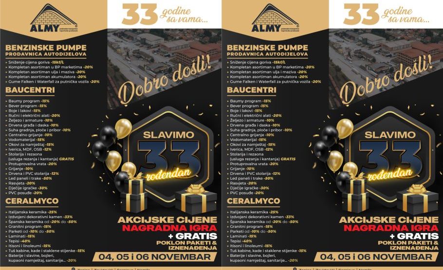 Kompanija Almy slavi 33. rođendan! 3️⃣3️⃣ 🎉🎊🎈 Od 04. do 06.11.2022. očekuju vas tri dana velikih sniženja u maloprodajnim objektima kompanije Almy 🛒🆒😍 Posjetite nas i uvjerite se nepobjedivo niske cijene i...
