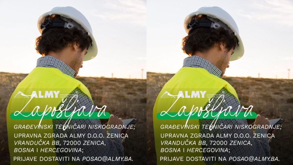Almy d.o.o. Zenica objavljuje konkurs za prijem u radni odnos: Pozicija: Građevinski tehničar niskogradnje; Lokacija: Zenica; Broj izvršilaca: Više izvršilaca; Opis posla: -Izrada građevinskih dnevnika -Planiranje, organizacija i nadzor građevinskih radova -Koordinacija sa izvođačima i...
