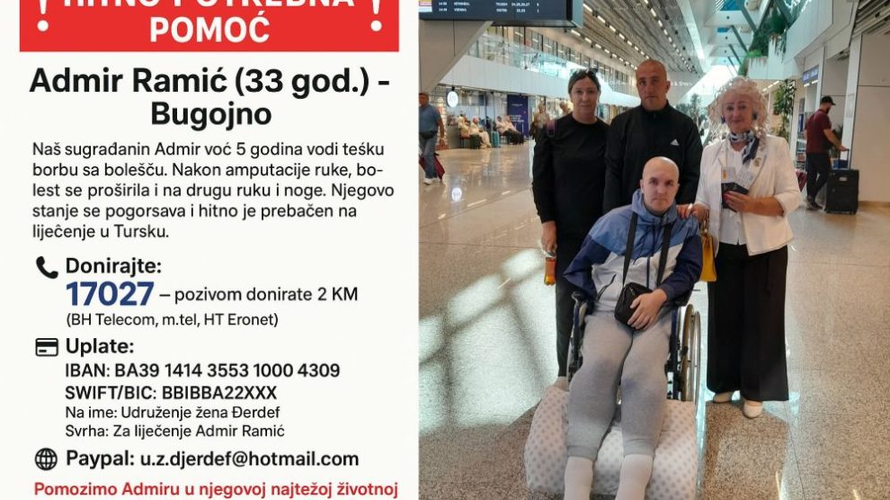 Humanitarno udruženje iz Bugojna pokrenulo je apel za prikupljanje sredstava za liječenje Admira Ramića (33), koji već pet godina vodi tešku borbu s bolešću. Nakon amputacije jedne ruke, bolest se proširila i na drugu ruku i noge, a njegovo zdravstveno stanje se pogoršalo, zbog čega je...