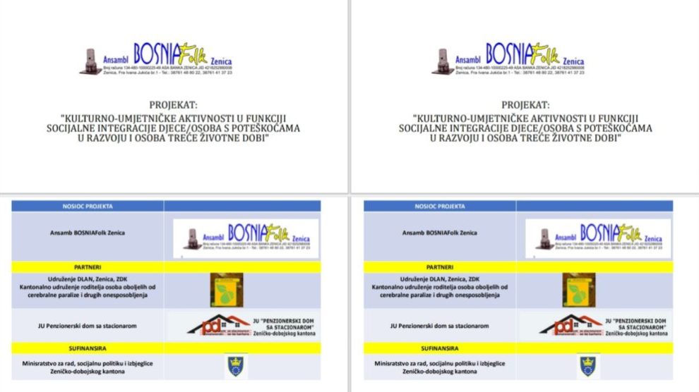 Ansambl BOSNIA Folk Zenica u saradnji sa JU Dom penzionera sa stacionarom Zeničko-dobojskog kantona i Udruženjem/Servisnim centrom „Dlan“ ZDK započinje realizaciju projekta pod nazivom „Kulturno-umjetničke aktivnosti u funkciji socijalne integracije djece/osoba s poteškoćama u razvoju i...