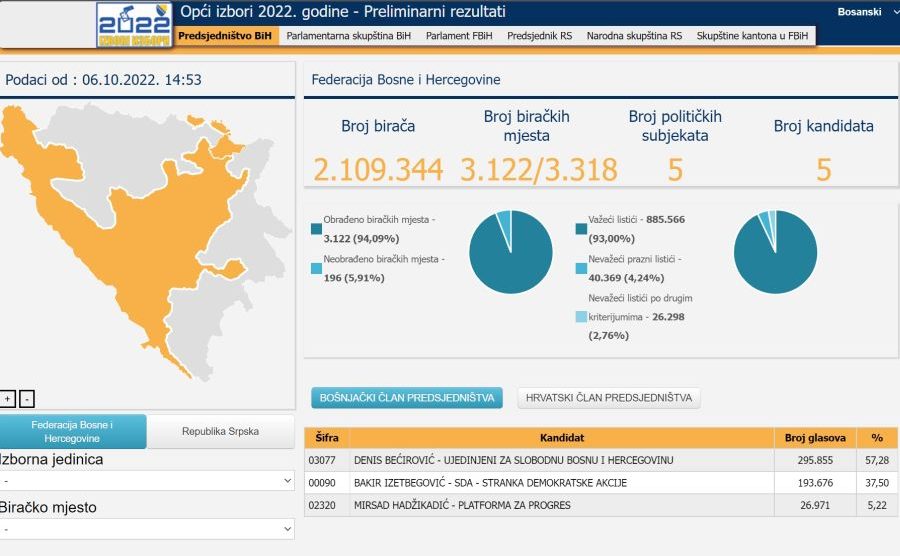 CIK BIH je ažurirao do sada prebrojane glasove za Predsjedništvo BIH, Parlamentarnu Skupštinu BIH i Parlament FBIH. Tako u FBIH za Člana Predsjedništva BIH vodi Denis Bećirović sa 57,28 posto glasova, dok je, gledajući samo glasove u Zenici, on osvojio 39,50 posto glasova. Pogledajte...