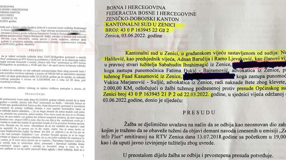 Kantonalni sud u Zenici donio je pravosnažnu presudu kojom je u većini potvrdio, uz manju korekciju, prvostepenu presudu Općinskog suda po tužbi zbog klevete, koju je protiv gradonačelnika Zenice, Fuada Kasumovića, podnio Sabahudin Ibrahimagić, direktor Kantonalnog poreznog ureda Zenica...