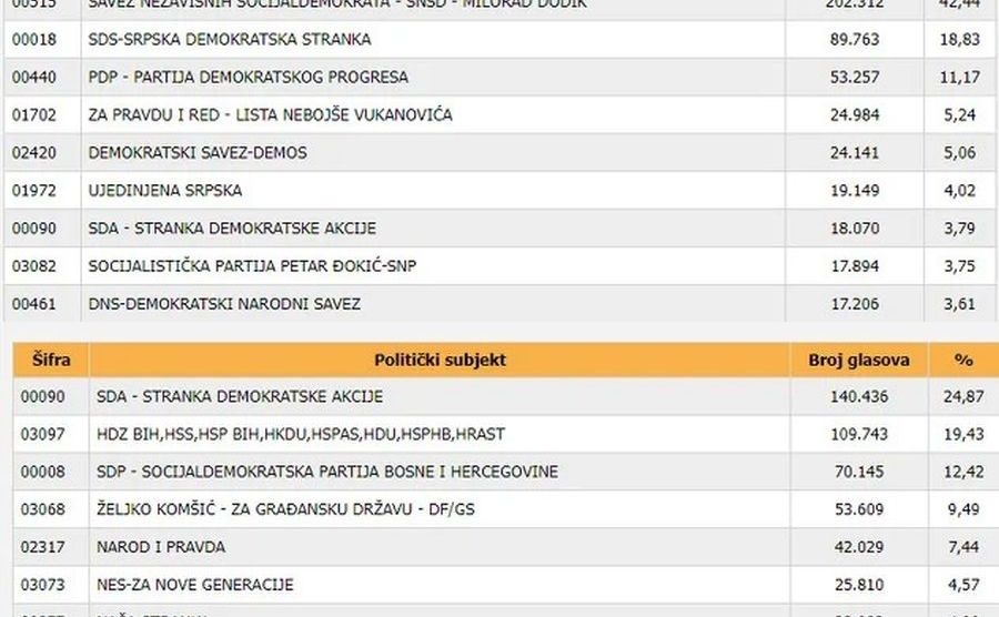 SDA i SNSD osvojile su najviše glasova za Parlament BiH, prema preliminarnim podacima koje je jutros objavila Centralna izborna komisija (CIK). Nakon 62 posto obrađenih biračkih mjesta iz FBiH, SDA je uvjerljivo prva sa 140.436 glasova ili 24,87 posto. Druga je koalcija okupljena oko HDZ...