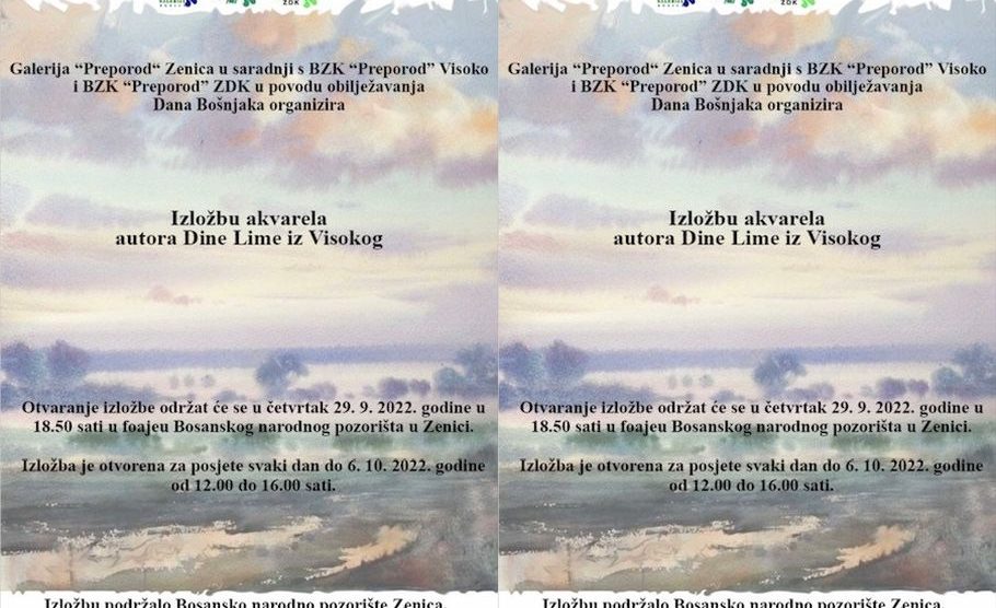 BZK Galerija „Preporod“ Zenica u okviru planiranih aktivnosti i u povodu obilježavanja Dana Bošnjaka, postavlja Izložbu akvarela ,autora Sabahudina –Dine Lime iz Visokog. BZK Galerija „Preporod“ Zenica izložbu akvarela Dine Lime, postavlja u saradnji sa BZK „Preporod“ Visoko i BZK...