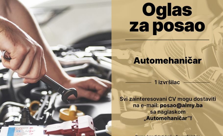 Oglas za posao: Automehaničar- Almy d.o.o. Zenica objavljuje konkurs za prijem u radni odnos: Pozicija: Automehaničar Izvršilaca: 1 Uslovi: – SSS, poželjan smjer automehničar, – Minimalno radno iskustvo u struci 2 godine, – Spremnost na timski rad. Mogućnosti koje vam...