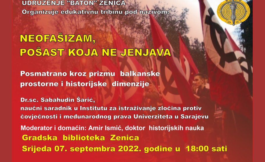 Obilježavajući 30 godina od početka Agresije na Republiku Bosnu i Hercegovinu, Udruženje ”Baton” Zenica organizuje edukativnu tribinu pod nazivom: NEOFAŠIZAM, POŠAST KOJA NE JENJAVA POSMATRANO KROZ PRIZMU BALKANSKE PROSTORNE I HISTORIJSKE DIMENZIJE Gost izlagač: Dr.sc. Sabahudin Šarić...
