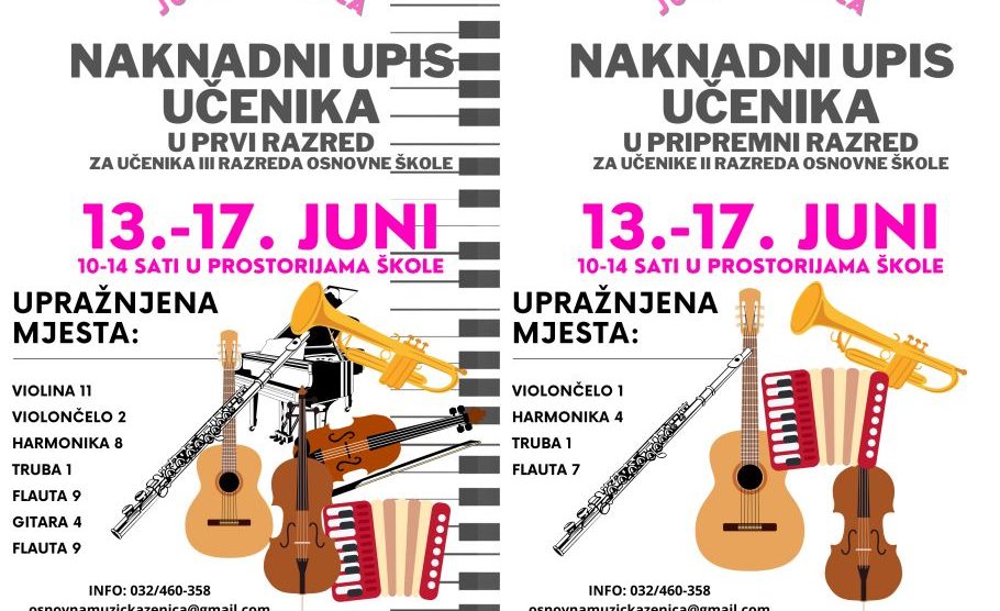 Osnovna muzička škola organizuje naknadni upis u PRIPREMNI i PRVI (I) razred škole za upražnjena mjesta po instrumentima. Upis se vrši za učenike II razreda osnovnih škola u PRIPREMNI razred i učenike III razreda u PRVI razred muzičke škole. Upis će se vršiti od 13.06.-17.06 u terminu...