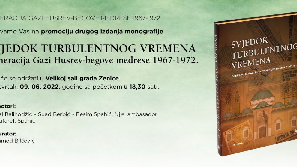Nakon izlaska iz štampe drugog izdanja Monografije, Svjedok turbulentnog vremena, Generacija Gazi Husrev-begove medrese 1967-1972. nastavlja se promocija ovo Monografije. U Zenici promocija je zakazana u četvrtak, 9.6.2022. godine u Velikoj sali Grada Zenice sa početkom u 18,30 sati...