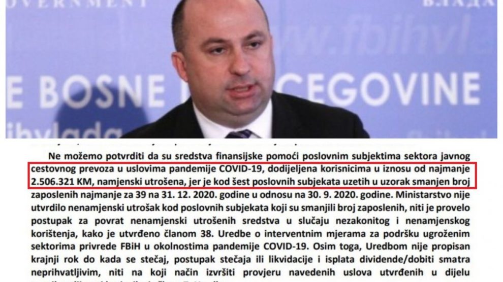 Federalni revizori dali su „mišljenje s rezervom“ Federalnom ministarstvu prometa i komunikacija nakon što su, uz ostalo, prilikom nadzora konstatirali da ovo ministarstvo nije utvrdilo nenamjenski utrošak odobrenih sredstava finansijske pomoći poslovnim subjektima sektora javnog...