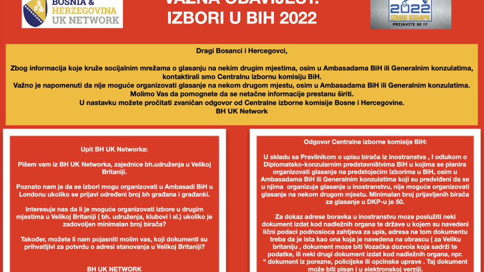 Dragi Bosanci i Hercegovci, Zbog informacija koje kruže socijalnim mrežama o glasanju na nekim drugim mjestima, osim u Ambasadama BiH ili Generalnim konzulatima, kontaktirali smo Centralnu izbornu komisiju BiH. Važno je napomenuti da nije moguće organizovati glasanje na nekom drugom...