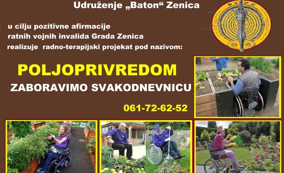 Udruženje „Baton“ Zenica u cilju pozitivne afirmacije ratnih vojnih invalida Grada Zenica, realizuje radno-terapijski projekat pod nazivom: POLJOPRIVREDOM ZABORAVIMO SVAKODNEVNICU Pozivaju se svi zainteresovani ratni vojni invalidi Grada Zenica, da ukoliko im preostale zdravstvene...