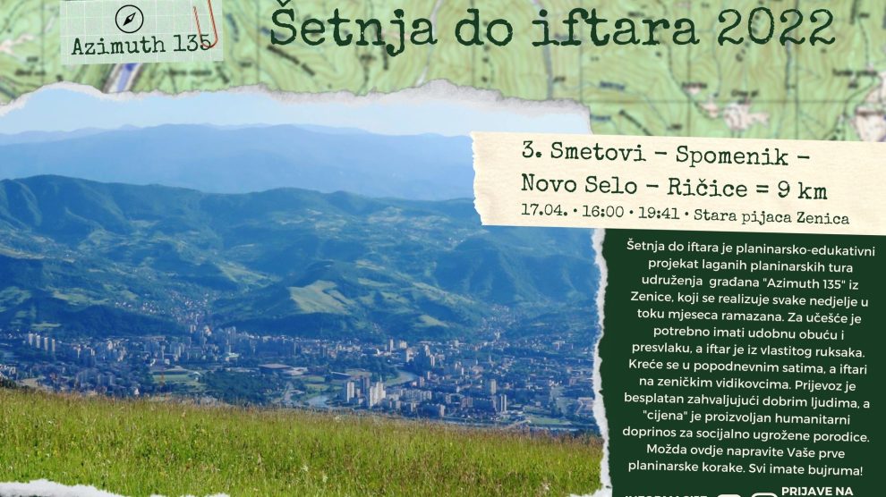 Treća #ŠetnjaDoIftara vodi nas u masiv Smetova, planine na istočnoj strani gradskog područja Zenice i najpopularnijeg zeničkog izletišta. Padine obiluju očuvanom bjelogoričnom šumom, a tura će nam pokazati jedan od njenih najljepših predjela. Autobus nas izvlači na parking na Smetovima...