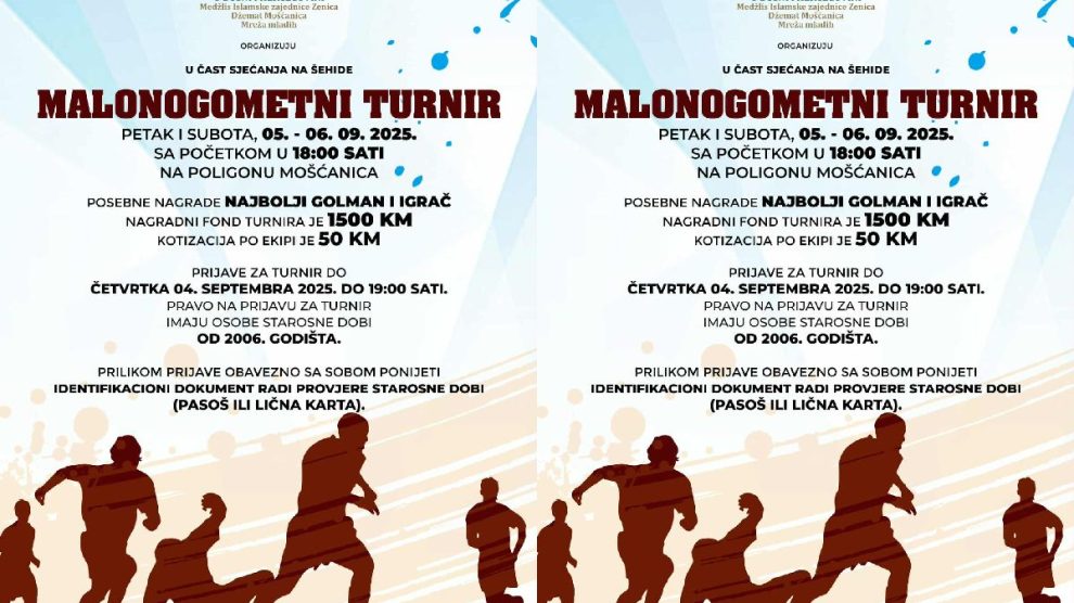 NAJAVA: ⚜️Turnir u čast sjećanja na šehide Mošćanice⚜️ Datum održavanja: 05. i 06. septembar 2025. (petak i subota) Lokacija: Stadion Mošćanica, Zenica Početak turnira: od 18:00 sati ℹ️ Pravila i informacije: • Kotizacija: 50 KM po ekipi • Pravo nastupa: igrači rođeni 2006. godište i...