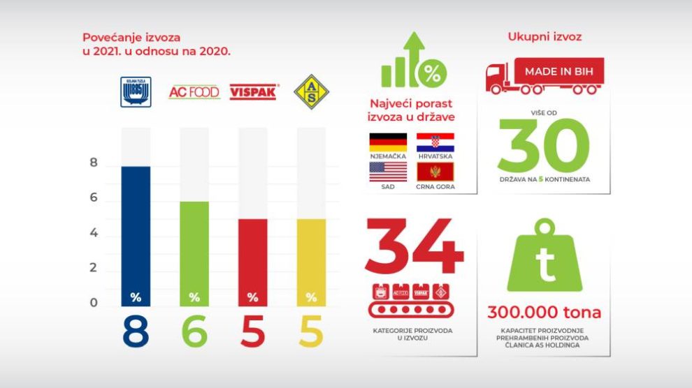 Kompanije AS Holdinga u prošloj godini povećale su izvoz u odnosu na 2020. godinu. Tako je prošle 2021. godine Solana Tuzla ostvarila povećanje izvoza za 8 posto u usporedbi sa 2020. godinom, Vispak i AS Jelah su rasli po 5 posto, a AC Food 6 posto. Najbolje rezultate postigli su brendovi...