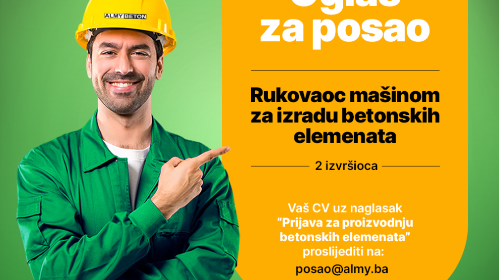OGLAS ZA POSAO- Rukovaoc mašinom za izradu betonskih elemenata- 2 izvršioca Lokacija: Lipice – Zenica Potrebne kvalifikacije: • Minimum III stepen stručne spreme • Opća zdravstvena sposobnost • Odgovorno postupanje sa opremom • Samostalnost i odgovornost u radu Nudimo: •...