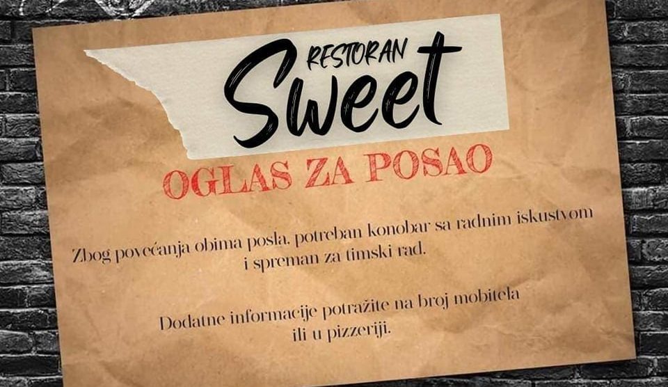 Zbog povećanja obima posla, restoranu Sweet potreban konobar sa radnim iskustvom!