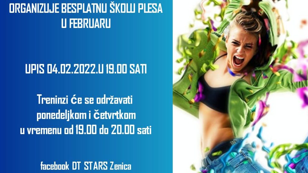 Dance team STARS Zenica poziva sve zainteresovane osnovce i omladince da se prijave na besplatnu školu plesa koja će se održavati u mjesecu FEBRUARU u okviru projekta “druženje i ples” koji se realizuje odlukom upravnog odbora udruženja. Prijavom, djeci se omogućava druženje u...