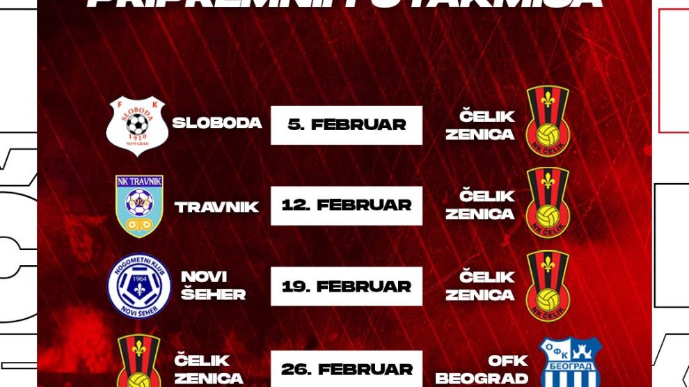 NK Čelik dogovorio četiri pripremne utakmice, OFK Beograd 26. februara u Zenici- Nogometni klub Čelik dogovorio je četiri pripremne utakmice uoči nastavka sezone. RASPORED PRIPREMNIH UTAKMICA: 5. februar 2022.: FK Sloboda Novi Grad – NK Čelik Zenica 12. februar 2022.: NK Travnik...