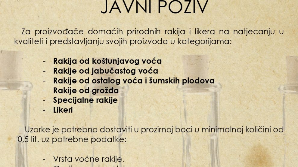 JAVNI POZIV Za proizvođače domaćih prirodnih rakija i likera na natjecanju u kvaliteti i predstavljanju svojih proizvoda u kategorijama: – Rakija od koštunjavog voća – Rakije od jabučastog voća – Rakije od ostalog voća i šumskih plodova...