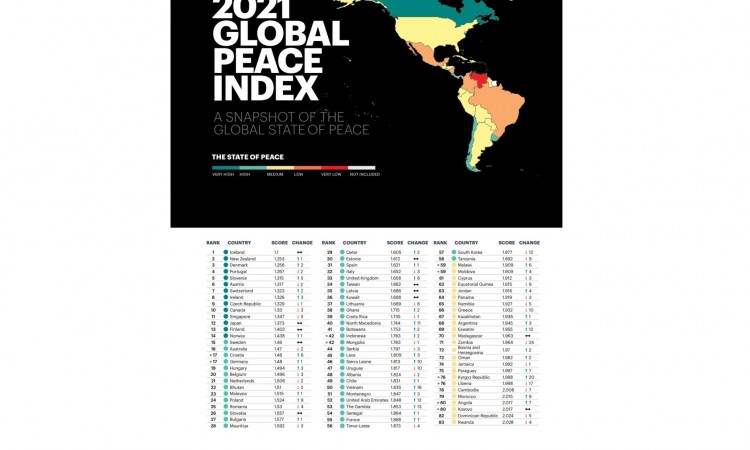 Island je bio najmirnija zemlja u 2020. u svijetu po podacima objavljenim u istraživanju “Global Peace Index”, što je pozicija koju drži od 2008., a slijede ga Novi Zeland, Danska, Portugal i Slovenija. Globalni mir pogoršan je devetu godinu zaredom, ove godine za 0,07 posto...