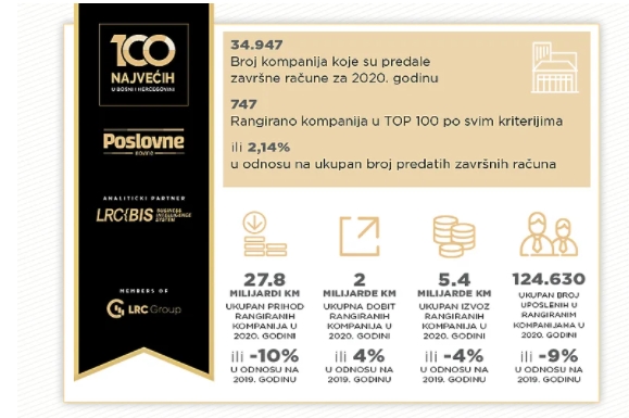 Stotinu najvećih u BiH: Preliminarni podaci u poražavajućoj godini- Ovogodišnji projekat “100 najvećih u BiH” realizuje se 34. put i biće interesantan, jer se podaci o kompanijama koje će se naći na rang-listama po različitim kriterijima odnose na 2020. godinu, koja će ostati...
