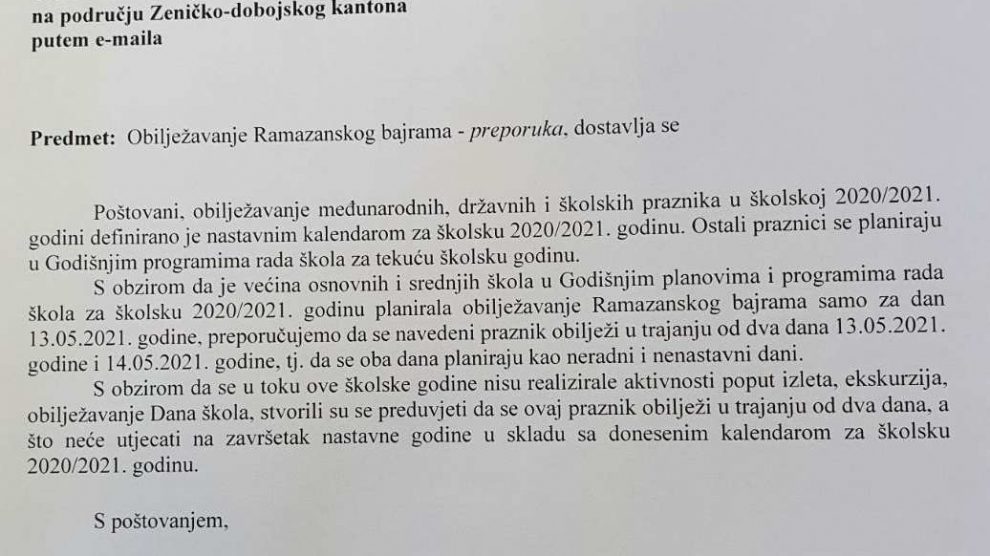 Ministar obrazovanja, nauke, kulture i sporta Spahija Kozlić potpisao je preporuku osnovnim i srednjim školama u Zeničko-dobojskom kantonu, koja – po nazivu, nije obavezujuća, te je konačna odluka ipak na upravama škola. Naime, ministar Kozlić je naveo da u protekloj školskoj godini...