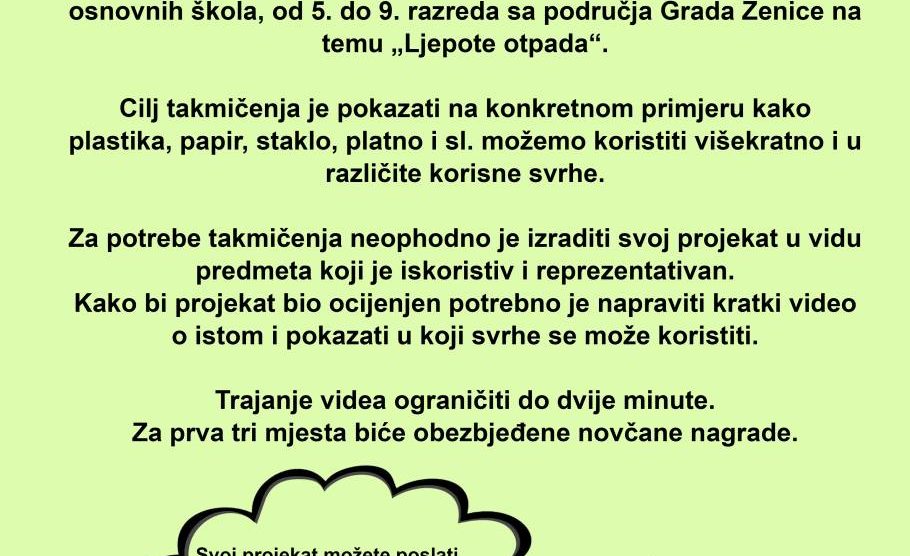 Poziv za takmičenje u kreativnom iskorištavanju otpada- U okviru projekta “Mali ekolozi, veliki poduhvati” Centar za mlade INPUT organizuje takmičenje za sve učenike osnovnih škola, od 5. do 9. razreda sa područja Grada Zenice na temu „Ljepote otpada“. Cilj takmičenja je...