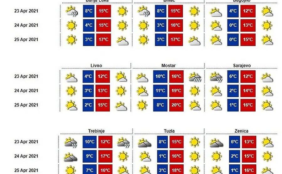 Od jučer su u Bosni i Hercegovini temperature u blagom porastu i to će se nastaviti i tokom vikenda. Očekuje se uglavnom sunčano vrijeme s umjerenom oblačnošću. U Bosni i Hercegovini će danas biti umjereno do pretežno oblačno vrijeme, a prije podne lokalno može pasti malo kiše...