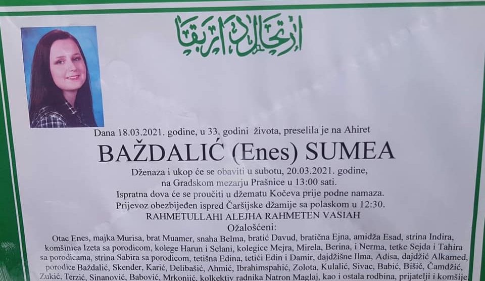 Dragi prijatelji, u dubokoj žalosti i sa tugom obavještavamo vas da je naša plivačica Sumea Baždalić koja je trenirala u PK Željezara Zenica jučer preselila na bolji svijet. Sumea je bila jedna od plivačica koja je branila boje našeg kluba, predstavljala svoj grad i državu i pored svih...