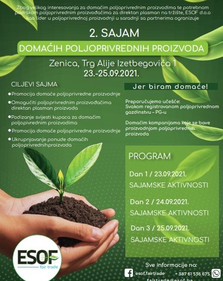 Obavještavamo Vas da će se ESOF FAIR TRADE 2. Sajam domaćih poljoprivrednih proizvoda održati u period od 23 do 25. septembra, 2021. godine na Trgu Alije Izetbegovića ispred robne kuće Bosanska u Zenici. Ciljevi sajma su promocija domaće poljoprivredne proizvodnje, jačanje svijesti kod...